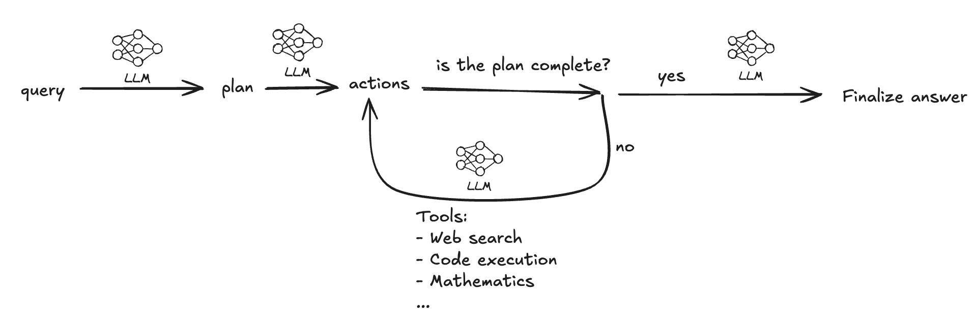 When a user submits a query, the AI creates a plan— a step-by-step guide to answering it. For each step in the plan, a list of search queries are generated and executed. These steps are executed sequentially, and results from previous steps are passed when executing steps after. These search queries return a list of documents, which are grouped and then filtered down to the most relevant ones. The highly-ranked documents are then passed to an LLM to generate a final answer.