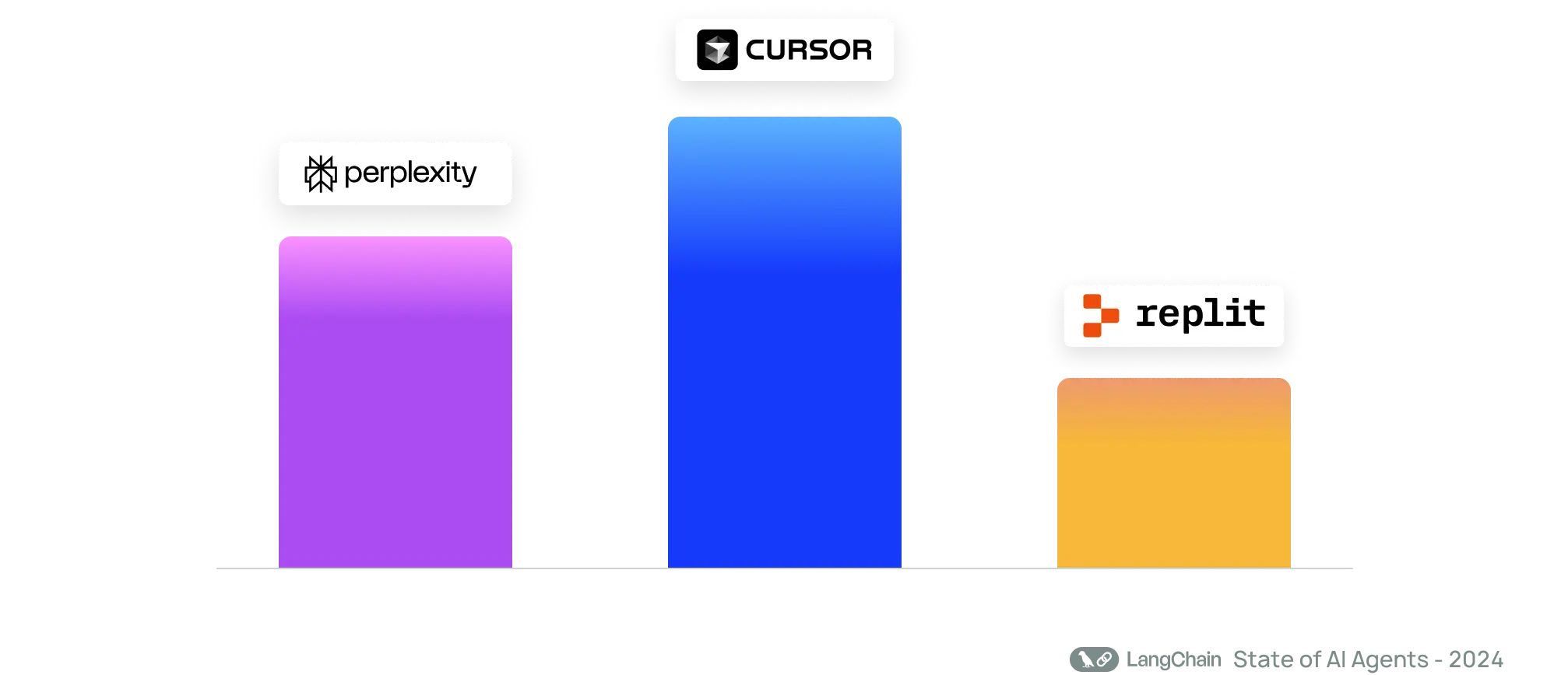 Cursor takes the crown as the most talked-about agent application in our survey, followed closely by heavyweights like Perplexity and Replit.