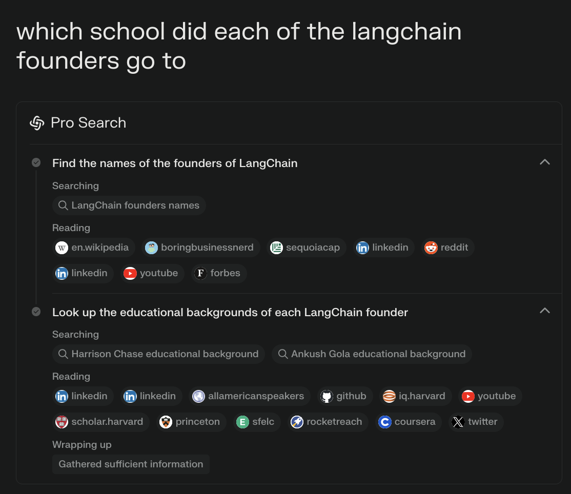 Traditional search engines may struggle to answer complex queries that require connecting the dots across multiple ideas or extracting detailed information. For instance, searching "What’s the educational background of the founders of LangChain?" involves not only identifying the founders but also researching into each individual founder’s background.